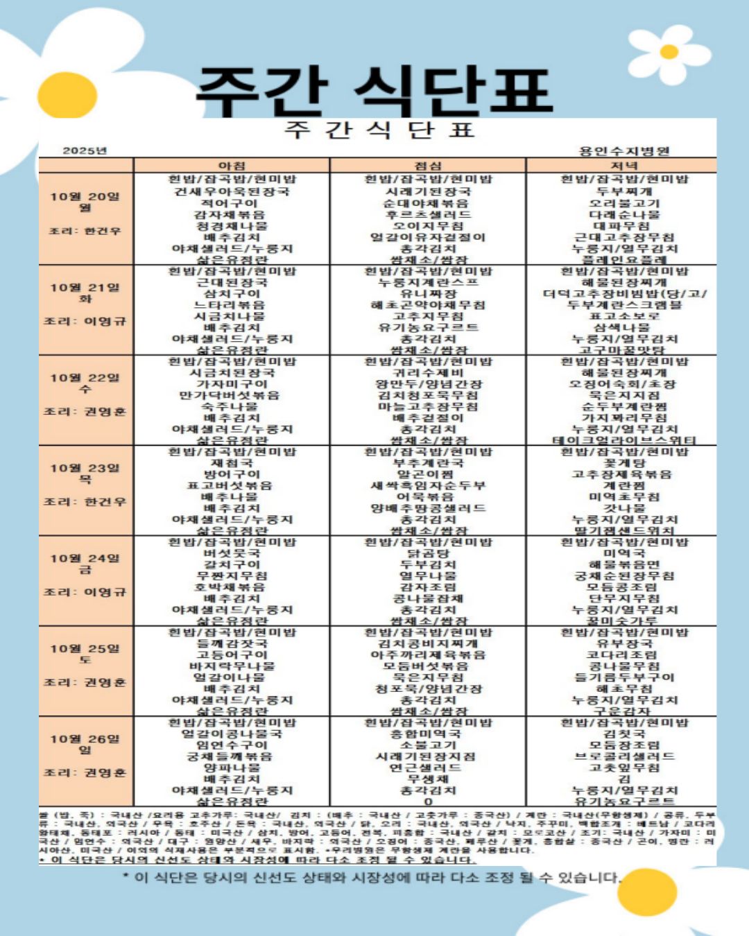 <주간식단표> 2025년 10월 20일 ~ 10월 26일 페이지 정보 작성자용인수지병원 조회 114회 작성일 2025-10-21 10:57:49 댓글 0 list_alt목록 본문 10월 4주차 항암식단 다음글<주간식단표> 2025년 10월 6일 ~ 10월 12일 arrow_forward list_alt 댓글 0 등록된 댓글이 없습니다.